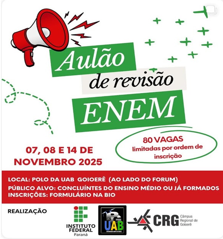 Com o objetivo de fortalecer a preparação dos participantes do Exame Nacional do Ensino Médio (ENEM), será realizado o Aulão de Revisão do ENEM, uma iniciativa desenvolvida em parceria entre o Polo UAB Goioerê, o Instituto Federal do Paraná (IFPR) e a Universidade Estadual de Maringá (UEM).