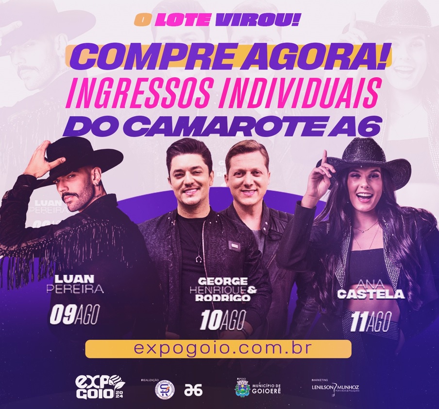 Aberta na última segunda dia 10, a venda individuais dos ingressos do camarote A6 para os shows, Luan Pereira, George Henrique e Rodrigo e da Ana Castela, seguem em ritmo intenso de vendas.