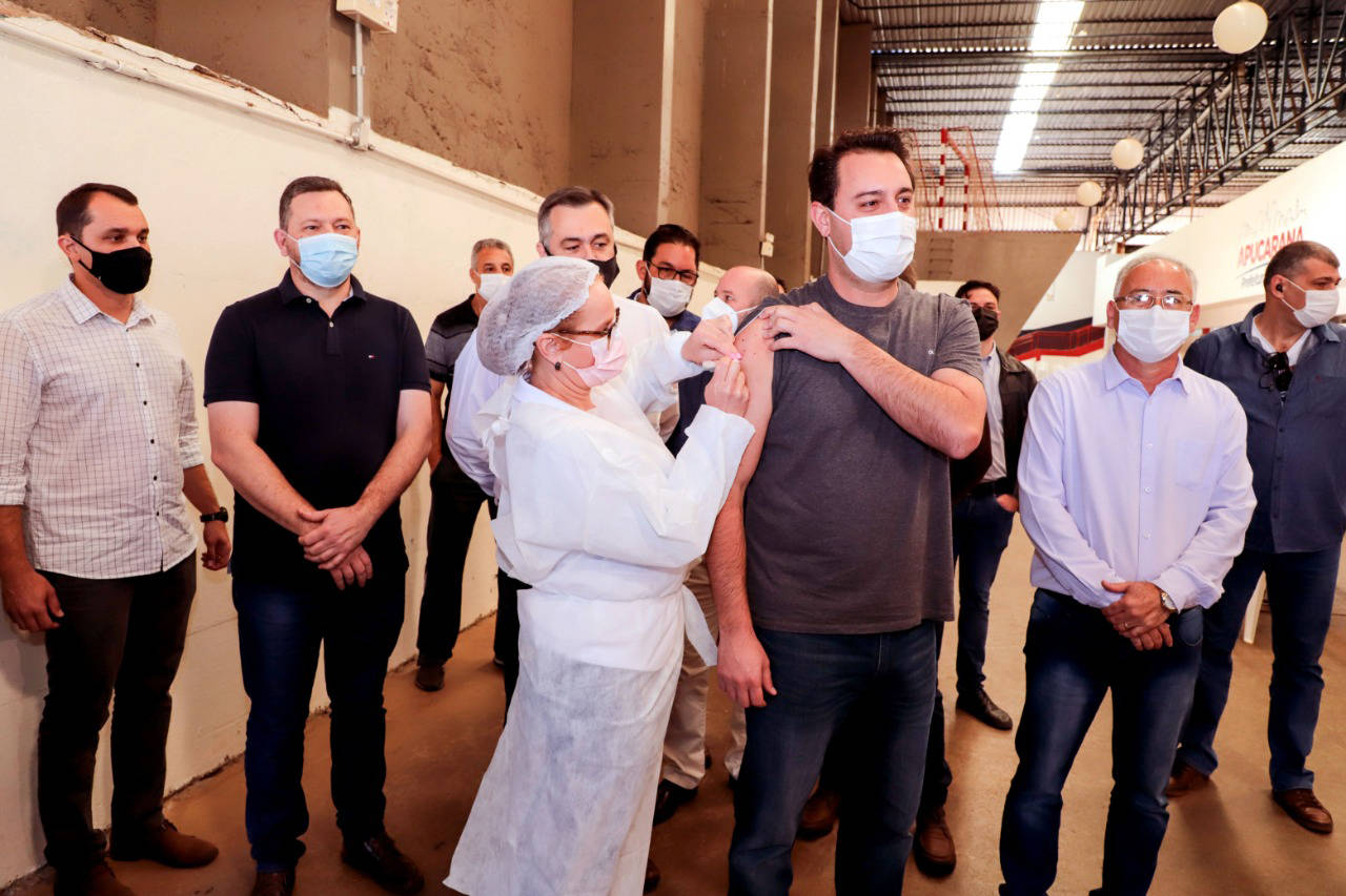 O governador Carlos Massa Ratinho Junior foi vacinado contra a Covid-19 na manhã deste domingo (11), em Apucarana. Ele chegou por volta das 9h30 no Ginásio de Esportes Lagoão e ficou cerca de 20 minutos na fila. Ele estava acompanhado do secretário de estado da saúde, Beto Preto.