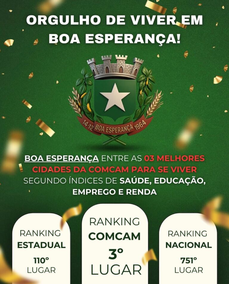 Com uma administração focada em melhorias estruturais, projetos e ações voltados para a qualidade de vida, o prefeito Joel Buscariol e sua equipe têm colhido resultados expressivos para Boa Esperança. Os indicadores recentes, que avaliam saúde, educação, emprego e renda, mostram que a cidade ocupa o 3º lugar entre os municípios da COMCAM para se viver, além de figurar no 110º lugar no ranking estadual e no 751º do nacional.