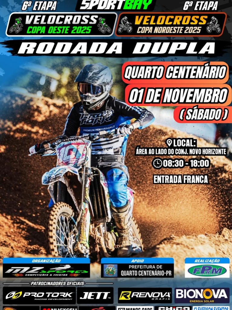 Adrenalina, velocidade e muita emoção vão marcar este sábado, 1º de novembro, em Quarto Centenário, que receberá pilotos de todo o Paraná para a rodada dupla do Velocross. O evento acontece durante todo o dia, a partir das 8h, e contará com a realização da 6ª etapa da Copa Oeste 2025 e da 6ª etapa da Copa Noroeste 2025.